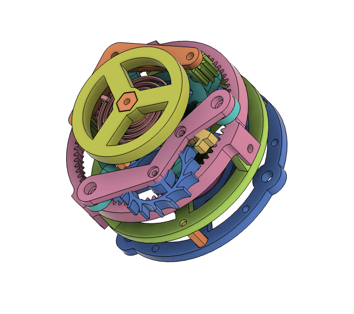 A fully 3D printed mechanical watch escapement that is powered by a main spring and regulated by a balance wheel.